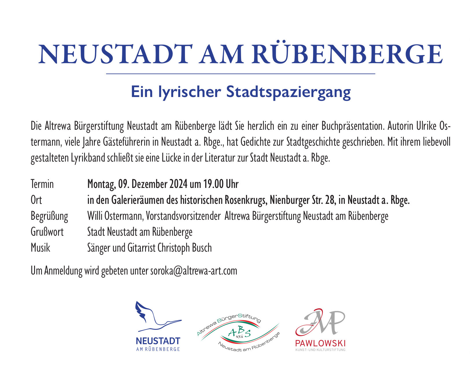 Ein lyrischer Stadtspaziergang Veröffentlicht am Dezember 9, 2024Januar 29, 2026 von admin Die Altrewa Bürgerstiftung Neustadt am Rübenberge lädt Sie herzlich zu einer Buchpräsentation ein. Teilen mit: Share on Facebook (Wird in neuem Fenster geöffnet) Facebook Mehr Share on X (Wird in neuem Fenster geöffnet) X