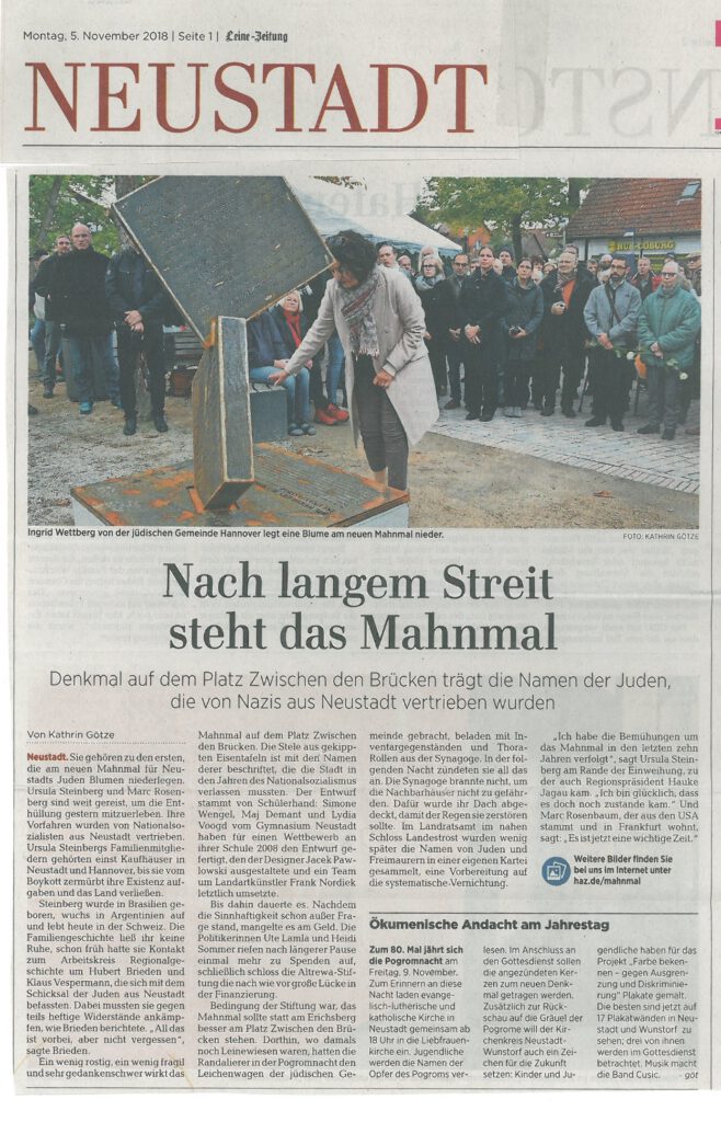 Der Neustädter Bürgermeister schlug daraufhin die Einrichtung eines Arbeitskreises vor, in dem Vertreter der Bürgerstiftung, des Arbeitskreises Regionalgeschichte, der Ortsbürgermeister, die beiden Politikerinnen Lamla und Sommer sowie Vertreter der Verwaltung teilnehmen sollten. Der Arbeitskreis hatte das Ziel, die Errichtung des Mahnmals rechtzeitig zum 80sten Jahrestag der Reichspogromnacht auf den Weg zu bringen. Auf Betreiben der Bürgerstiftung beschloss der Ortsrat einen neuen Standort für das Mahnmal, nicht auf einer abgelegenen Wiese am Erichsberg, sondern an prominenter Stelle in der Fußgängerstraße zwischen den Brücken. Die Altrewa Bürgerstiftung finanzierte den Großteil des Projektes. Der Arbeitskreis konnte nun den Landartkünstler Frank Nordiek und sein Team mit der Überarbeitung und Fertigstellung des Siegerentwurfs aus dem Schülerwettbewerb von 2008 beauftragen. Das Denkmal wurde rechtzeitig zum 09.11.2018 aufgestellt und feierlich eingeweiht.
